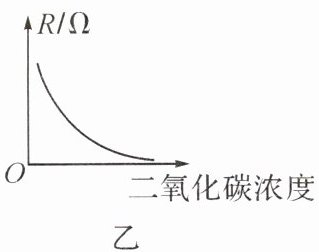 13. (2024·合肥长丰县一模)教室长时间密闭会导致室内二氧化碳浓度上升,从而影响学生的听课效率。如图甲所示,这是某科技小组设计的检测二氧化碳浓度的电路原理图,电源电压保持不变,$ R_{0} $ 为定值电阻,R 是检测二氧化碳浓度的气敏电阻,其阻值与二氧化碳浓度的关系如图乙所示。闭合开关 S,当二氧化碳浓度变大时 (