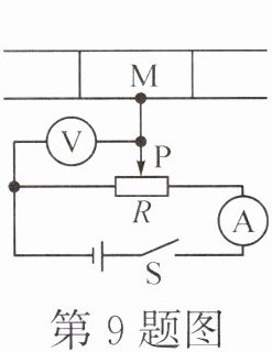 9. (2024·滁州天长市三模)计算机鼠标内装有自动控制传感器,其工作原理电路如图所示。物体 M 在导轨上左右移动时,可带动与之相连的滑动变阻器滑片 P 左右移动,通过电压表示数变化可反映出物体 M 移动的距离。当物体 M 向左移动时 (