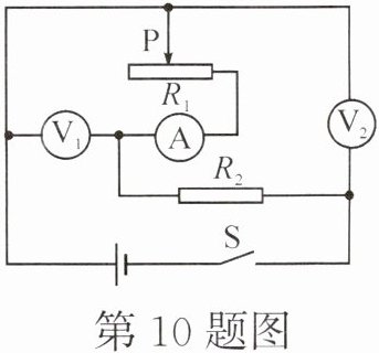 10. 如图所示,电源电压恒定不变,闭合开关 S,将滑动变阻器 $ R_{1} $ 的滑片 P 向右移动,下列说法正确的是 (
