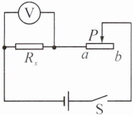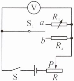 ,移动滑动变阻器$R$的滑片$P$至适当位置,此时电压表的示数为$U$;保持滑片$P$的位置不变,再将开关$S_{1}$拨至另一触点,调节电阻箱$R_{1}$的阻值,使电压表的示数恰好为U