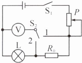 V。(2)保持滑片$P$的位置不变,再将开关$S_{2}$拨到触点 1,读出电压表的示数并记为$U_{2}$。