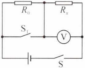 1. 在“伏安法”测电阻的实验中,只有一个电压表和一个已知阻值的定值电阻$R_{0}$,小明设计了如图所示的电路,同样可以测量未知电阻$R_{x}$的阻值,请将实验步骤补充完整。