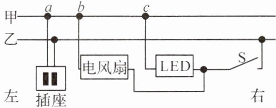13. (2024·广州)如图,某家庭电路的输电线甲、乙从右端进户。闭合开关 S,LED 灯发光、电风扇正常工作,用试电笔检测插座,只有检测右孔时氖管发光。由于出现故障,电风扇停止工作,LED 灯仍发光,用试电笔检测插座两孔,氖管均发光。该故障是(