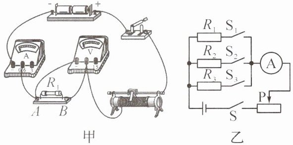 4. (2024·泰州节选)同学们用如图甲所示的电路探究通过导体的电流与电阻的关系,依次将阻值为5Ω、10Ω、20Ω的定值电阻$R_{1}$、$R_{2}$、$R_{3}$接入AB之间完成实验,记录的数据如表所示。