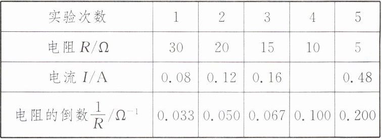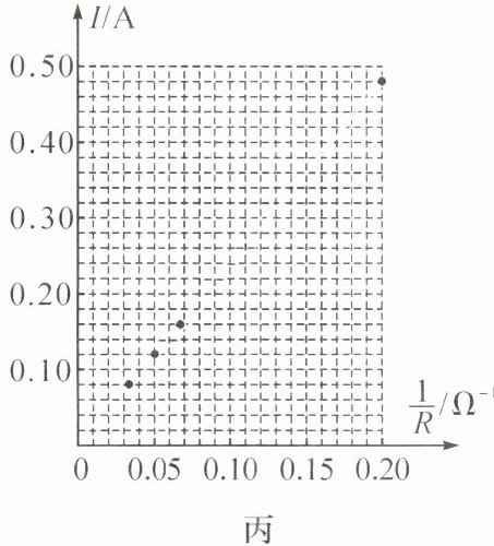 (3)为了更精确地描述I与R的关系,在表中增加了$\frac{1}{R}$的数据,并根据I、$\frac{1}{R}$的值在图丙的坐标纸中描出了相应的点,请你在图丙中补充第4次的实验数据点,并作出I-$\frac{1}{R}$图像。