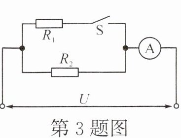 3. (2024·合肥瑶海区期末)如图所示的电路中,电压U保持不变,其中$ R_1 = 40 \ \Omega $、$ R_2 = 30 \ \Omega $。当开关S断开时,电流表示数为0.4 A,则当开关S闭合时,电流表示数为