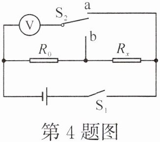 4. (2023·安徽)如图所示的电路中,电阻$ R_0 = 12 \ \Omega $。闭合开关$ S_1 $,将单刀双掷开关$ S_2 $掷于a端,电压表示数为2.5 V;将$ S_2 $切换到b端,电压表示数为1.5 V,则电阻$ R_x $的阻值为