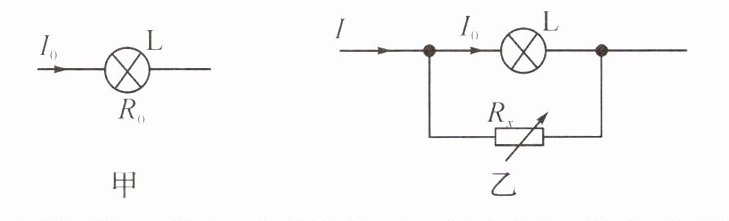 9. (2024·合肥蜀山区期末)如图甲所示是实验室里某种型号的灯泡L,它的阻值为$ R_0 $且保持不变,它正常发光的电流为$ I_0 $。现把这个灯泡与一个电阻箱并联接入到电流恒定为I的稳流电路中,已知$ I = nI_0(n > 1) $,如图乙所示。为了保证灯泡安全工作,调节电阻箱使得通过灯泡的电流恰好为$ I_0 $,此时电阻箱的电阻为$ R_x $。