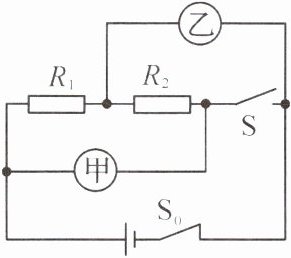5. (2024·淮南期末)如图所示的电路,电源电压恒定,开关$ S_0 $闭合。当开关S闭合,甲、乙两表为电压表时,甲、乙两表示数之比$ U_{甲} : U_{乙} = 3 : 1 $,当开关S断开,甲、乙两表为电流表时,此时电阻$ R_1 $、$ R_2 $的阻值之比为