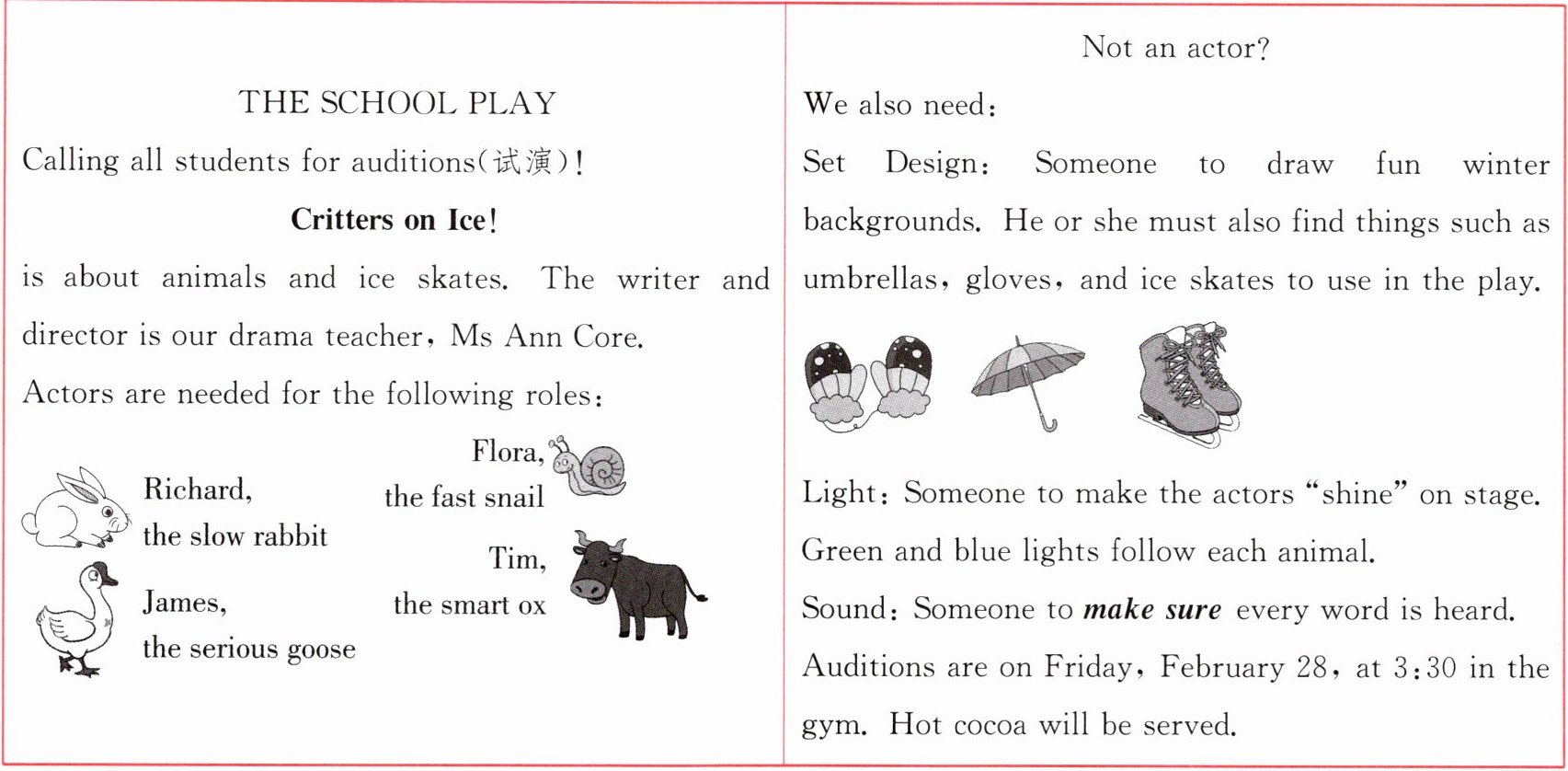 2。 B 细节理解题。根据表格第二栏中“Set Design: Someone to draw fun winter backgrounds.”可知,如果你做的是场景设计,你就要准备有趣的背景。