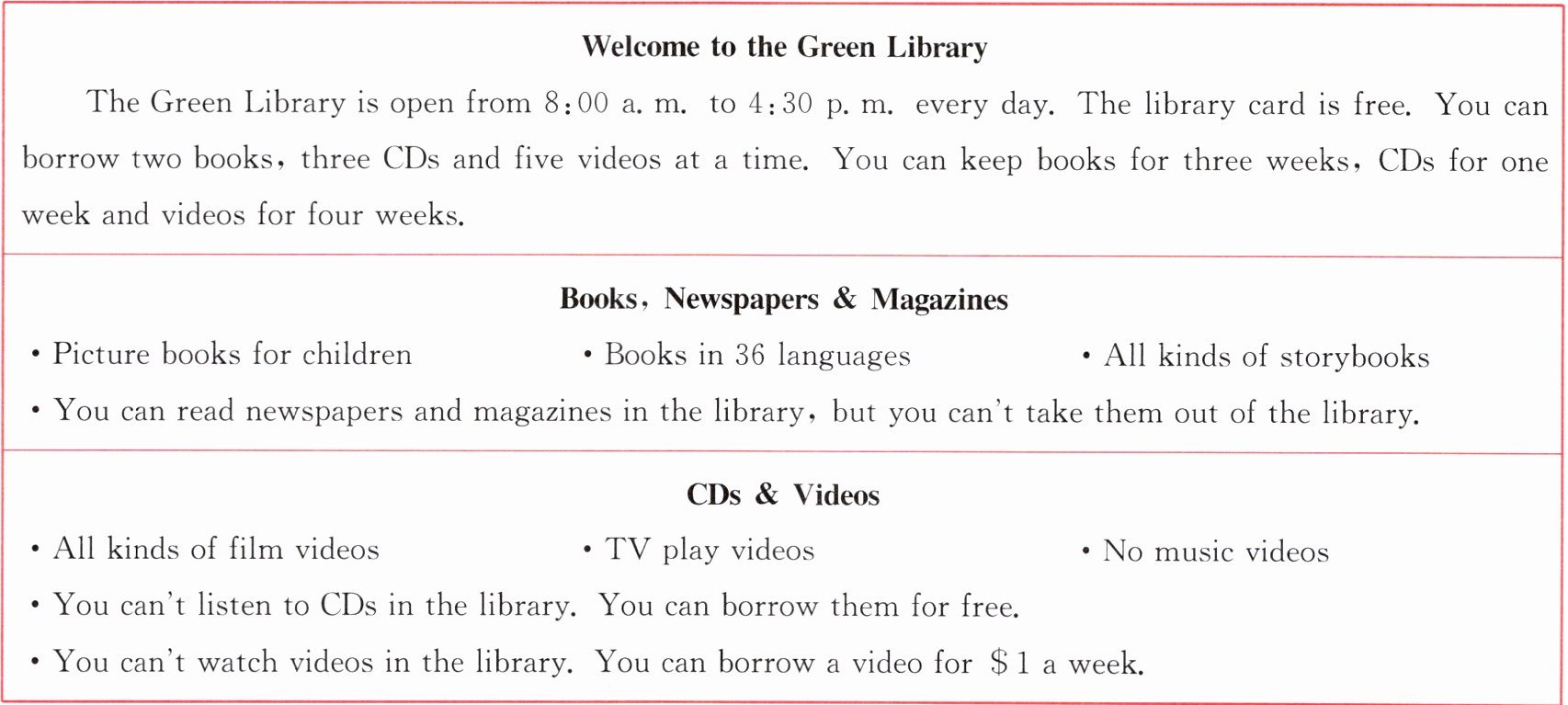 A. Lisa and Jack work in the Green Library.B. Children can read storybooks in the Green Library.C. People can't take newspapers or magazines out of the Green Library.D. We need to pay $2 if we want to keep a video for two weeks.