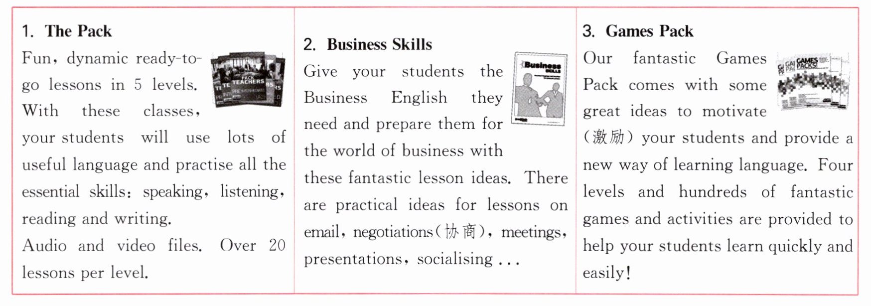 )1. What can students learn from the Business Skills product?A. How to play games. B. Skills for negotiations.