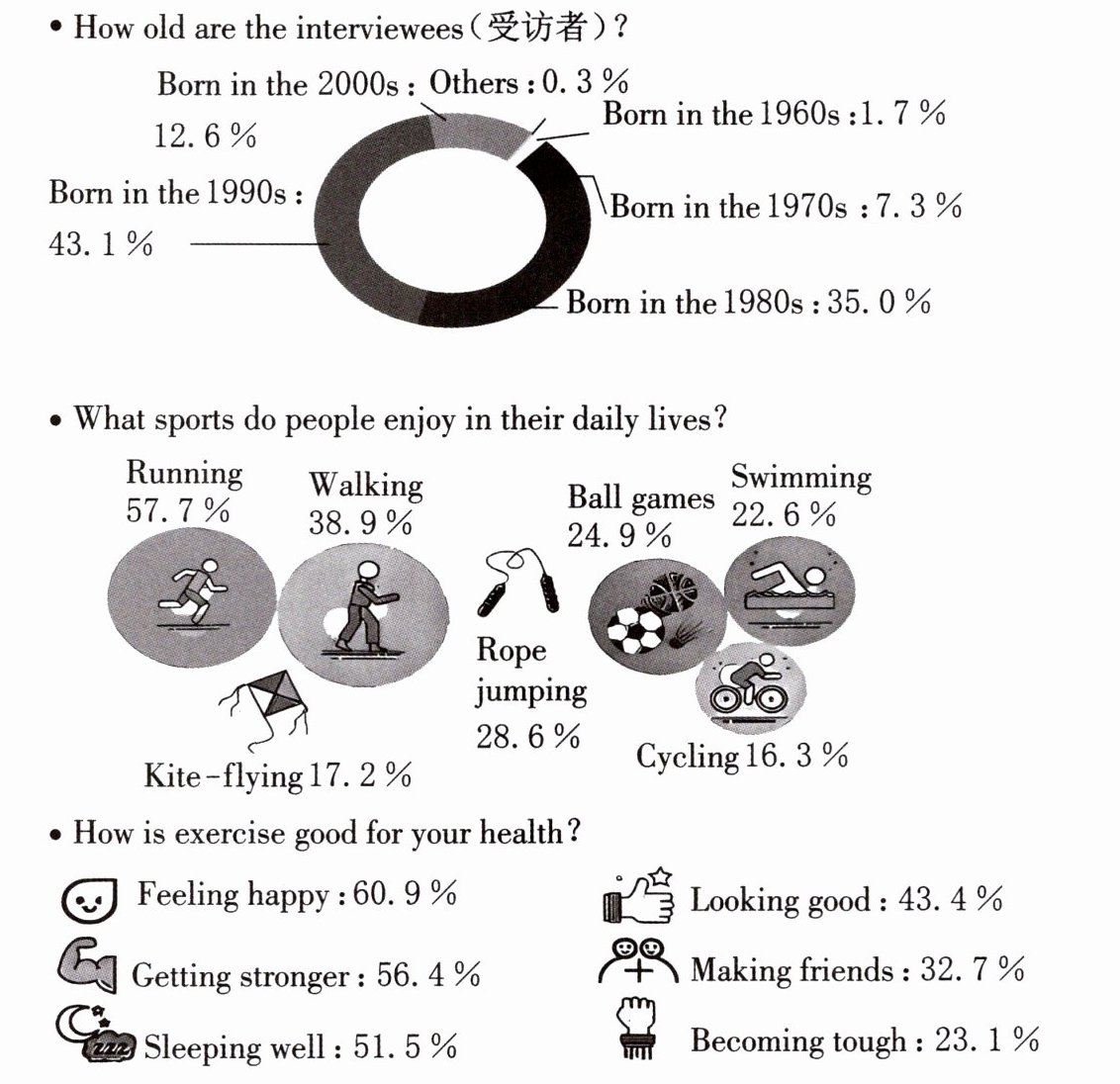 )1. Which is the most popular sport?A. Running. B. Swimming. C. Walking. D. Cycling.