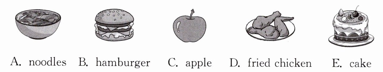 )1. Nelly likes sharing her new ideas with her friends, so what might she choose?A. The noodles. B. The hamburger. C. The apple. D. The fried chicken.
