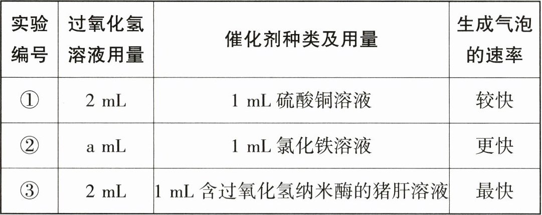 为探究肿瘤缺氧治疗的更多方案,同学们查阅资料了解到铁基纳米材料、铜基纳米材料、过氧化氢纳米酶也是肿瘤缺氧治疗的研究方向,于是设计实验比较如下不同催化剂对过氧化氢分解的催化效果,用等浓度的过氧化氢溶液按如表进行实验,并记录相同时间内产生气泡的速率:(已知:猪肝溶液中含有丰富的过氧化氢纳米酶,其能催化过氧化氢分解)