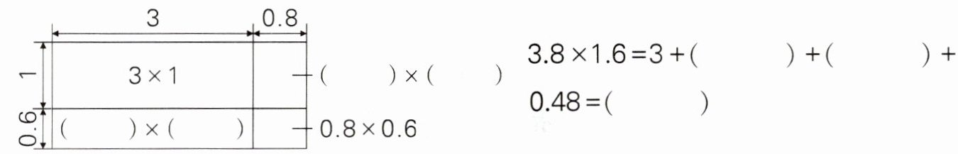 8. 算理题 状状在计算$3.8×1.6$时,采取的方法是“$3.8×1.6= 3×1+0.8×0.6= 3+0.48= 3.48$”。才才看到后,发现状状算错了,并画了一个长方形帮状状验证。