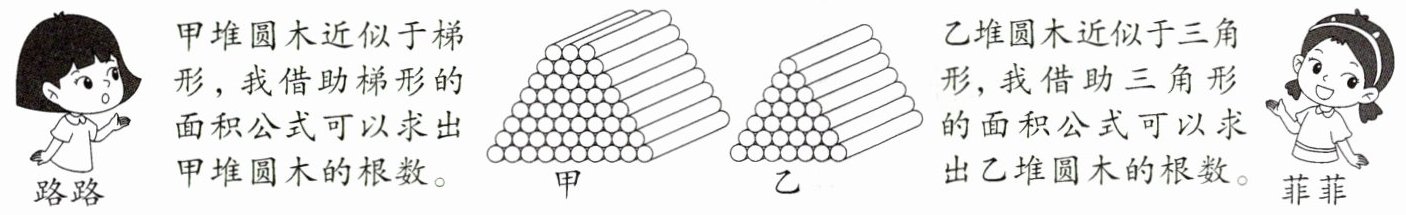 路路:甲堆圆木近似于梯形,我借助梯形的面积公式可以求出甲堆圆木的根数。