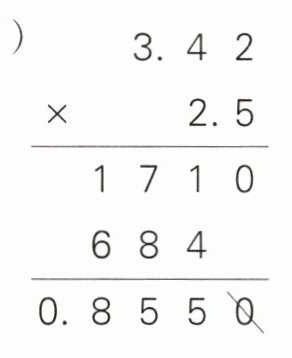 ①积中点错小数点。 ②当积中小数位数不够时,没有补0。 ③积末尾有0时,先去掉0,再点小数点。