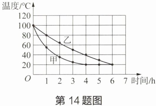 14. 现有甲、乙两种不同品牌的保温杯。为了比较这两种品牌的保温杯盛水时的保温效果,小明按照科学探究的程序,明确了具体的探究问题,选择了适当的器材,在控制变量的前提下,在室内进行了实验,得到了一段时间内甲、乙两种保温杯内水的温度的实验数据,根据数据绘制的图像如图所示。请你根据图像所提供的信息回答以下问题: