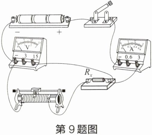 9. 小明做“用电流表和电压表测量电阻”实验,他将最后一根导线连接完毕后的实物图如图所示。请指出小明连接的电路中的错误之处: