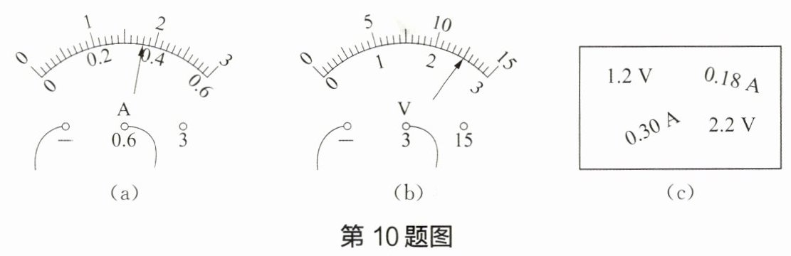 10. 小刚做“用电流表和电压表测量电阻”实验,他正确连接电路。闭合开关后,两电表示数分别如图(a)、图(b)所示,小刚将该组数据填写在下表实验序号 1 中。他继续实验,将测得的另两组实验数据随手记录在如图(c)所示的草稿纸上。
