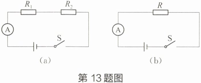 13. 在理论推导出串联电路等效电阻 $ R = R_{1} + R_{2} $ 后,小明通过实验来验证该关系。他将 $ 10Ω $ 的电阻 $ R_{1} $ 和 $ 15Ω $ 的电阻 $ R_{2} $ 接入如图(a)所示的电路中,闭合开关 $ S $ 后记录电流表示数 $ I $;在如图(b)所示电路中接入不同阻值的电阻 $ R $,直至闭合开关 $ S $ 后电流表示数与 $ I $ 相同,发现此时 $ R $ 的阻值为 $ 35Ω $,实验结论与理论推导矛盾。