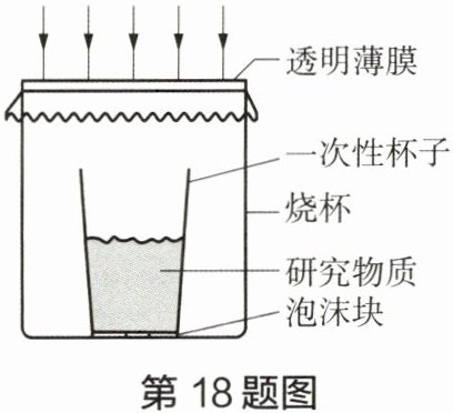 18. 某兴趣小组研究物质吸收热量的多少与哪些因素有关,他们在一个一次性杯子中装黄沙或干泥土后放入烧杯中,烧杯口用透明薄膜密封,然后放在阳光下暴晒(假设每分钟物质吸收太阳辐射的热量相等),如图所示。每次实验时,小组同学测出研究物质的质量,并用DIS设备(图中未画出)测出暴晒的时间及升高的温度,并将实验数据记录在表一、表二、表三中。