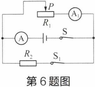6 在如图所示的电路中,滑动变阻器$R_{1}接入电路部分的阻值与电阻R_{2}$的阻值相等,开关$S$、$S_{1}$均处于闭合状态。下列方案中,完成操作后不可能使电流表$A_{1}示数与电流表A$示数的比值较操作前变大的是(
