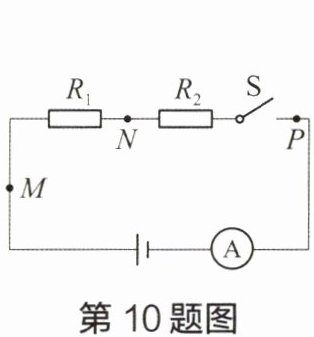 10 在如图所示的电路中,电源电压为$U$且保持不变,电阻$R_{1}$、$R_{2}的阻值均为R_{0}$。闭合开关$S$,电路正常工作。一段时间后,观察到电流表的示数突然变大。已知电路中仅有一处故障,且只发生在电阻$R_{1}或R_{2}$上。