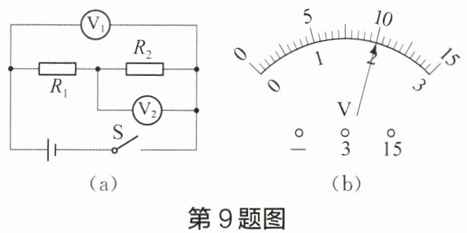 9 如图(a)所示的电路,闭合开关$S$后,两电压表的指针偏转情况均如图(b)所示,则电阻$R_{1}两端电压U_{1}= $