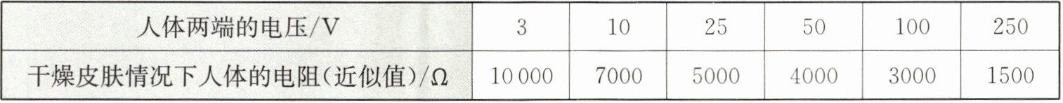|干燥皮肤情况下人体的电阻(近似值)/$\Omega$|10000|7000|5000|4000|3000|1500|