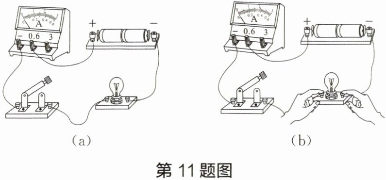 11 某小组同学做“用电流表测电流”实验。他们将两节干电池、开关、小灯按正确的方法连接成电路。闭合开关,小灯发光,电流表示数为$0.36A$,如图(a)所示。一位同学将双手同时接触小灯两侧的接线柱时,发现小灯仍发光,电流表示数仍为$0.36A$,如图(b)所示。为了解释为什么电流表示数为$0.36A$时,人体仍是安全的,他们查阅了资料,得知:一般情况下人体的安全电流不超过$10mA$;干燥皮肤情况下,人体两端的电压不同,人体的电阻不同,如下表所示。