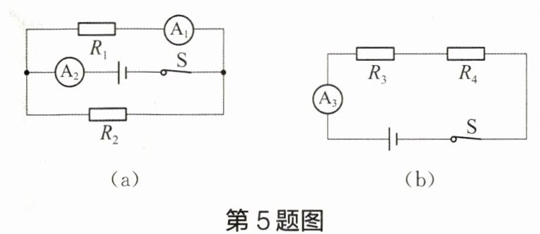 5. 在如图(a)、图(b)所示的电路中,所有元件均完好,电源电压相等且保持不变。现电流表$A_{1}$、$A_{2}$、$A_{3}$中有两个示数相同,则下列判断中正确的是(