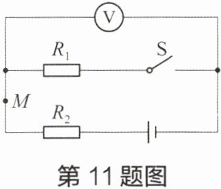 11. 在如图所示的电路中,电源电压为$U_{0}$且保持不变,闭合开关$S$,电路正常工作。一段时间后,电压表的示数变为$U_{0}$。已知故障只发生在电阻$R_{1}或R_{2}$上。