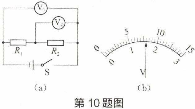 10. 如图(a)所示电路,闭合开关$S$后,两电压表指针偏转均如图(b)所示,则电阻$R_{1}和R_{2}$两端的电压分别为