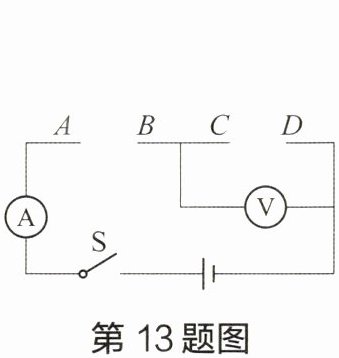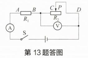 13. 请在如图所示的电路中的$A$、$B和C$、$D之间分别填画定值电阻R_{1}和滑动变阻器R_{2}$的元件符号。要求:闭合开关$S$后,向右移动滑动变阻器的滑片$P$时,电流表的示数变小,电压表的示数变大。