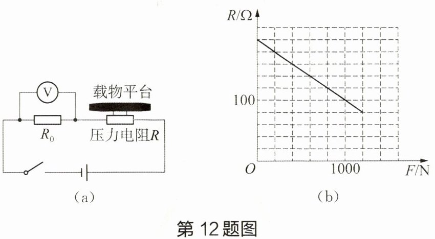 12. 如图(a)所示为某型电子体重计的电路原理图。该电子体重计主要由电源(4节干电池)、定值电阻$R_{0}$、压敏电阻$R$[其阻值随压力变化关系的图像如图(b)所示],电压表、开关等构成。电压表指针偏转角度可反映人体的质量。