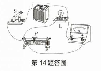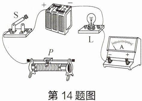 14. 在如图所示的电路中,有两根导线尚未连接,请用笔画线代替导线补上。补上后要求:闭合开关$S$后,小灯泡$L$才能发光;向右移动滑动变阻器的滑片$P$,小灯泡$L$亮度不变,电流表的示数变小。