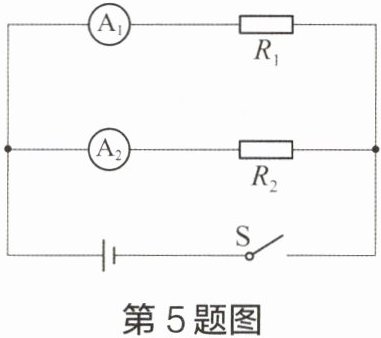 5 在如图所示的电路中,电源电压保持不变,电阻 $ R_1 $ 的阻值为 $ 20 \, \Omega $。闭合开关 $ S $,电流表 $ A_1 $ 的示数为 $ 0.3 \, A $,电流表 $ A_2 $ 的示数为 $ 0.2 \, A $。求: