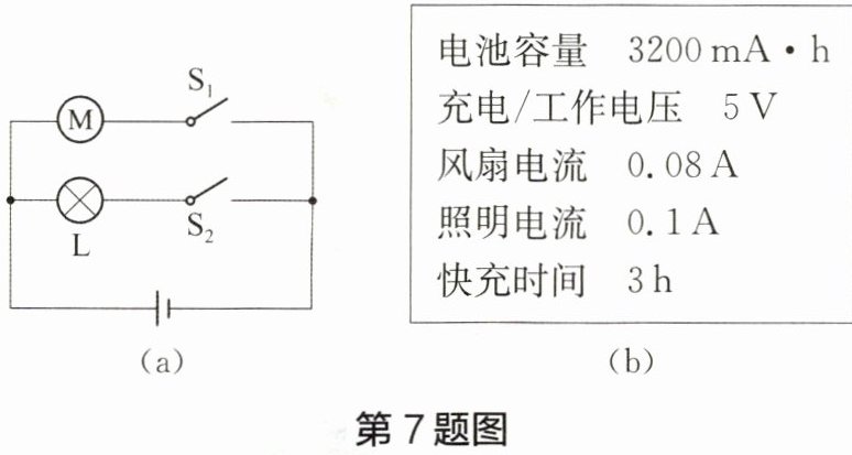 7 某型迷你风扇兼具照明功能,其工作电路如图(a)所示,工作参数如图(b)所示。请根据相关信息回答下列问题。