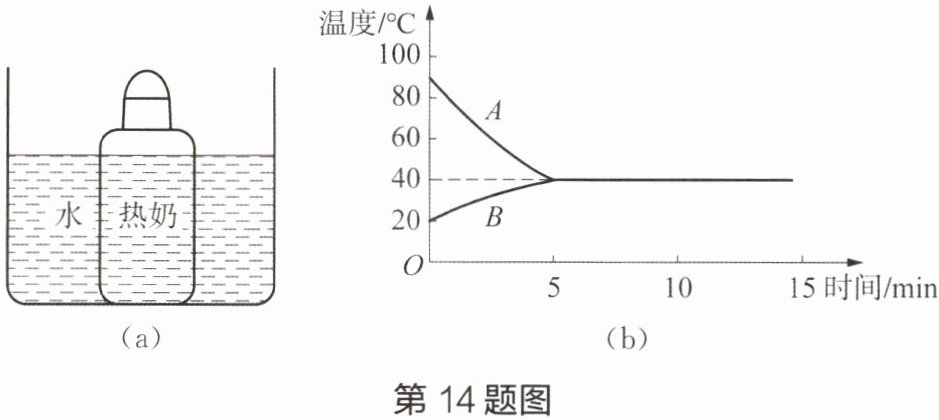 14 如图(a)所示,将装有热奶的奶瓶放入水中冷却;如图(b)所示,根据测得的数据,作出热奶和水的温度随时间变化关系的图像。根据图像回答下列问题: