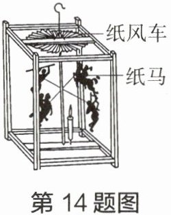 14. 如图所示,点燃走马灯内的蜡烛,纸筒内部的空气温度升高,体积膨胀,密度变
