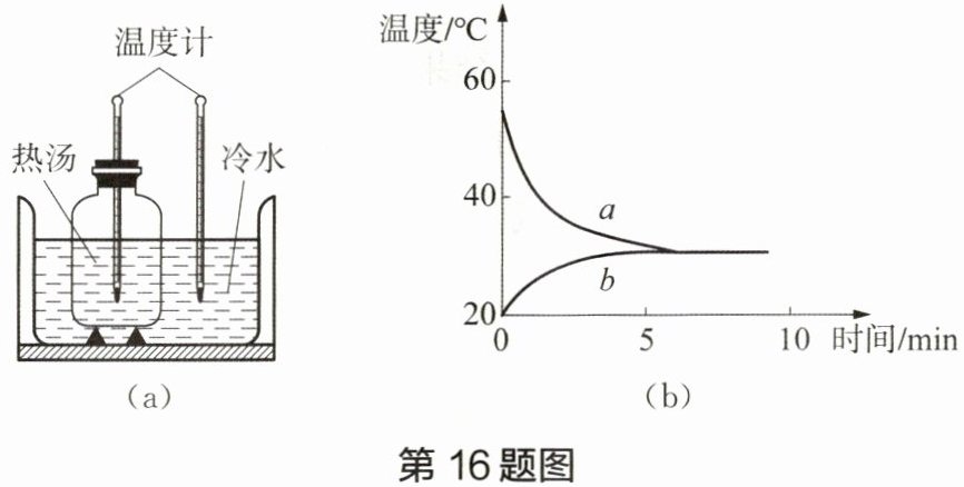 16. 如图(a)所示,将热汤放在冷水中;图(b)反映了热汤和冷水的温度变化,其中图线