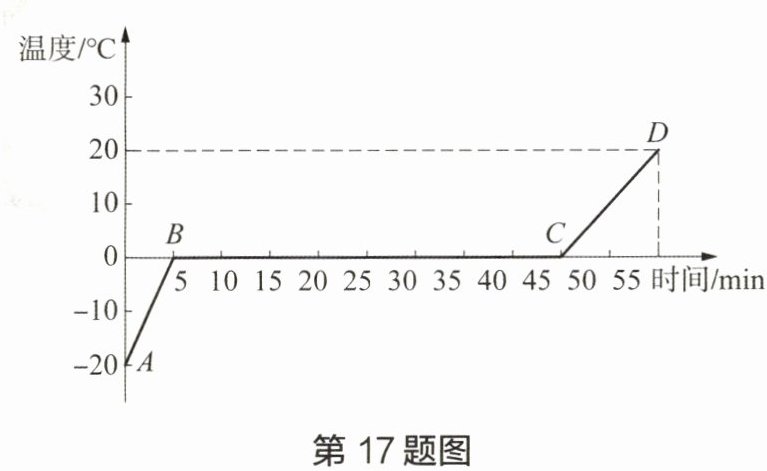 17. 小明利用电热器加热,完成了冰的熔化实验,并绘制出冰(水)的温度随加热时间变化关系的图像(如图所示)。实验时,冰的初始质量为0.5 kg,相同时间内水和冰吸收的热量相同。已知$c_1= 4.2×10^3 J/(kg·℃)。$
