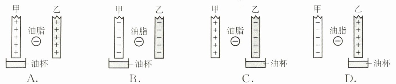5 厨房烟雾中含有水汽、空气和油脂液滴等,直接排放会污染空气。抽油烟机可有效减少油烟污染,它的“静电分离”技术可让甲、乙金属板和油脂液滴分别带上电荷,当烟雾由下往上从两金属板间通过时,空气和水汽不带电可顺利通过,而带电的油脂液滴会被一侧的金属板吸附,并流入下方的油杯中。下列示意图中,金属板所带电荷及油杯位置符合要求的是(