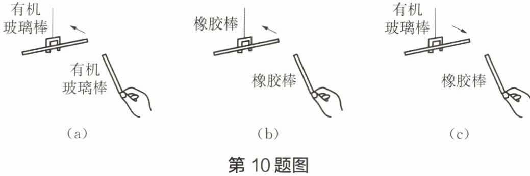 10 用丝绸摩擦有机玻璃棒,用毛皮摩擦橡胶棒,使有机玻璃棒和橡胶棒都带电,然后让它们相互靠近,根据图(a)、图(b)、图(c)所示的实验现象探究带电物体间的相互作用。这个实验还能说明自然界中至少存在