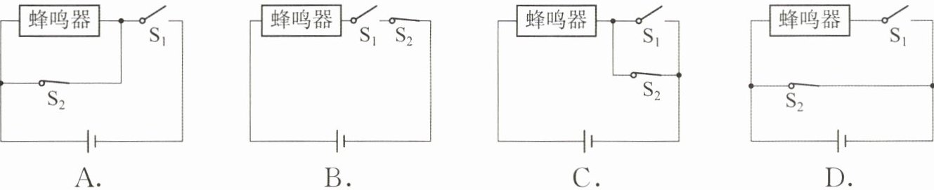 6 某探究小组想给自行车设计提醒收支架和锁车的电路,要求:当车的支架支起(开关 $ S_1 $ 闭合)时,蜂鸣器响起,提醒锁车;当车上好锁抽出钥匙(开关 $ S_2 $ 断开)后,蜂鸣器停止发声。他们设计了以下四个电路,其中符合上述要求的是(