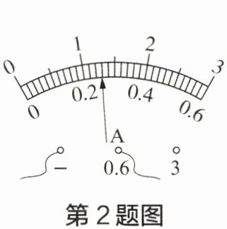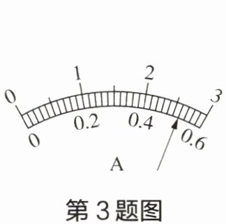 3. 如图所示,在用电流表测电流时,电流表接的是“一”和“$ 0.6 $”两个接线柱,可小明在读数时却按 $ 0 \sim 3 \, A $ 的量程读数,读得的值为 $ 2.6 \, A $,则实际的电流为(