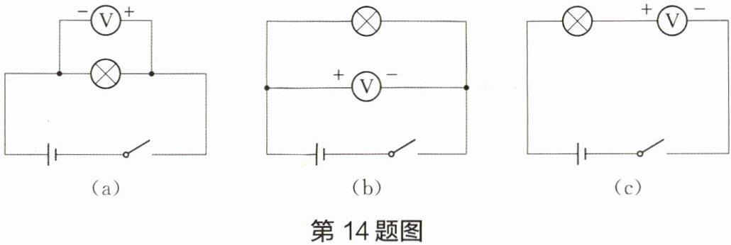 14. 判断如图所示的使用电压表测量小灯泡两端电压的电路图的正误,若错误,请指出错误之处。