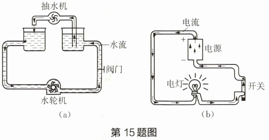15. “类比”是学习初中物理的一种常用方法。如图所示,我们用水路类比电路,用水流类比电流来解释电流的形成。